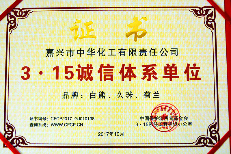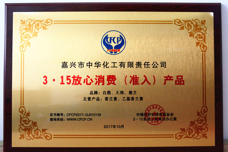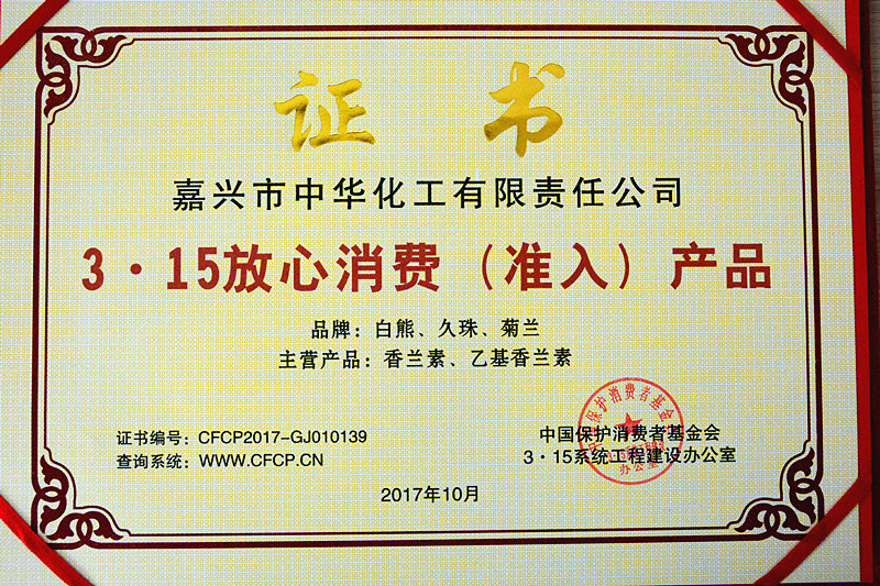 為貫徹落實黨和政府關(guān)于建立健全社會征信體系,褒揚誠信,懲戒失信和建立營造良好的法制環(huán)境,增強社會消費信心,中國保護消費者基金會根據(jù)《消費者權(quán)益保護法》所賦予消費者組織的工作職能,開展了推進3.15系統(tǒng)工程,發(fā)展維護消費者權(quán)益“3.15誠信體系單位”征信“放心消費(準入)品牌/產(chǎn)品”專題活動。在本次評選活動中,我公司喜獲“3.15誠信體系單位”榮譽稱號;白熊、久珠、菊蘭牌香蘭素、乙基香蘭素榮膺“放心消費(準入)品牌/產(chǎn)品”榮譽稱號。
