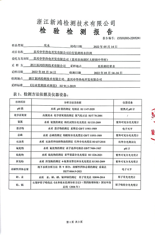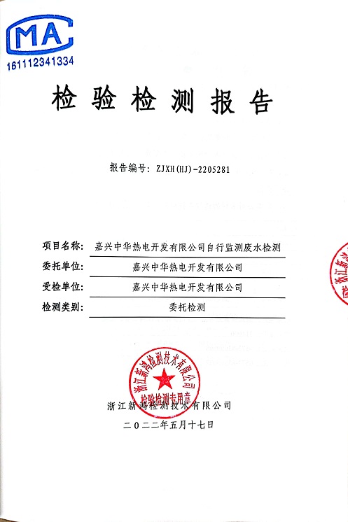 報(bào)告名稱:中華熱電2022.5月廢水檢測(cè)報(bào)告